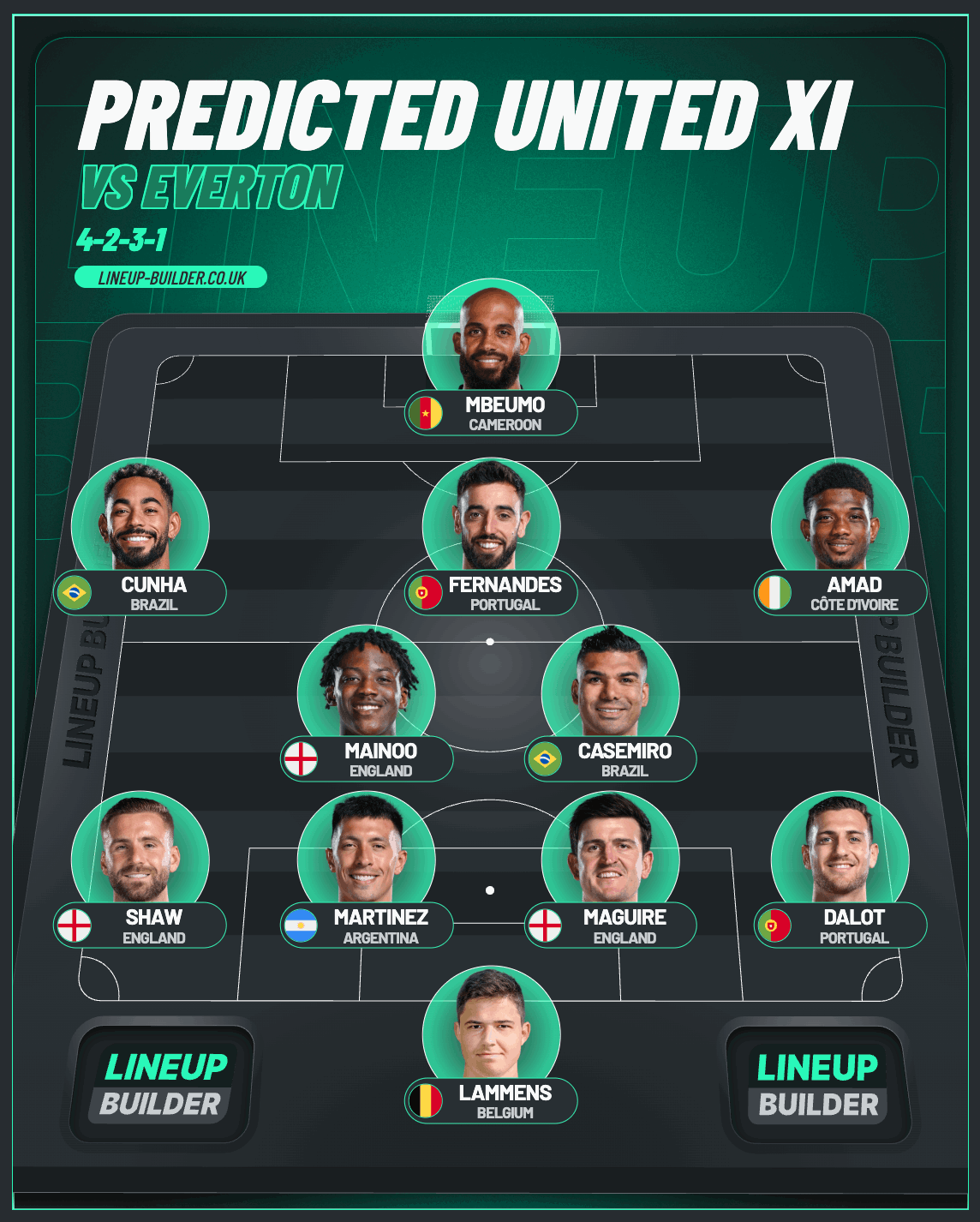 The holding midfield pair of Casemiro and Kobbie Mainoo has been on fire lately, and the pair will surely start again on Monday. Ahead of them, Bruno Fernandes will play in the number 10 position.