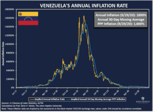 Figure 1. Venezuela’s Hyperinflation, 2017–2020: The cost of unchecked monetary sovereignty. By Steve Hanke, JHU.
