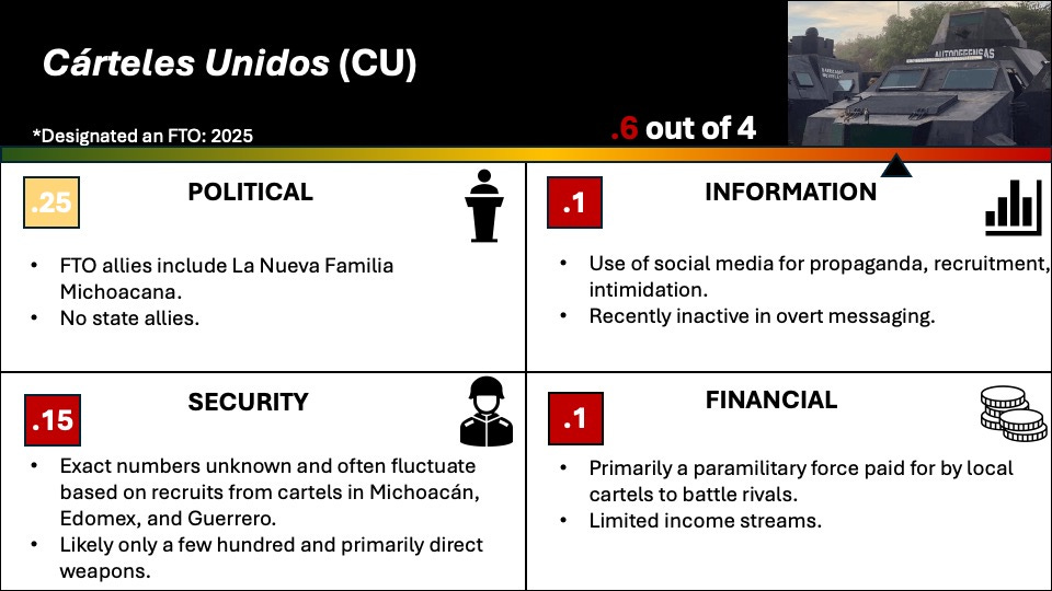 Cárteles Unidos functions through a loosely centralized, consensus-based model that resembles a militia alliance more than a traditional cartel. While it assigns formal roles and coordinates armed actions, it lacks independent financing and a strong information strategy. Despite its political relevance as a coalition, Cárteles Unidos holds limited overall influence and ranks among the least influential U.S. designated foreign terrorist organizations in Mexico.