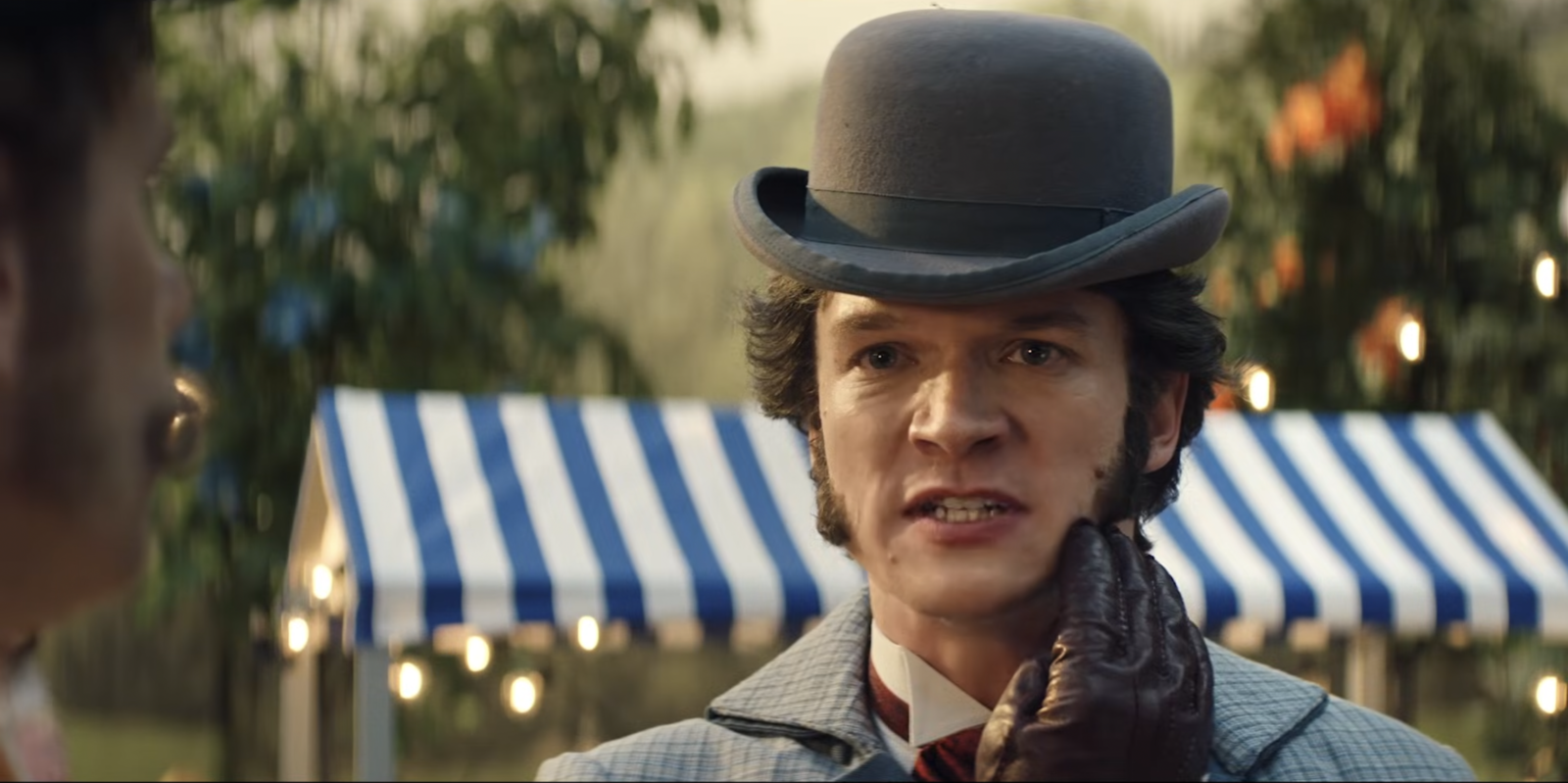 Man in victorian era bowling hat wearing gloves touches his face