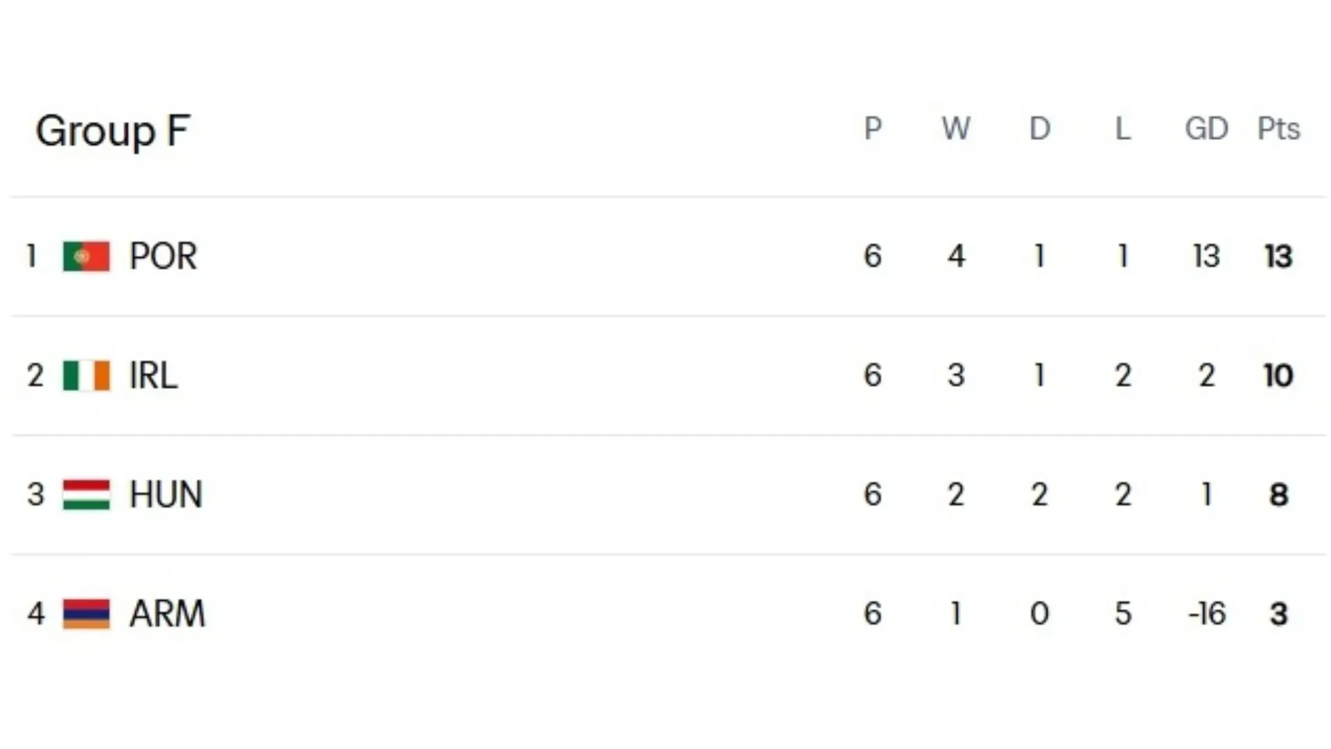 During the first half of the qualifiers, Portugal overwhelmed their opponents and seemed close to qualifying without issues. However, a last-minute draw against Hungary and a loss against Ireland —including a red card for Cristiano Ronaldo— added some drama to the group. Nevertheless, Portugal secured the top spot, while Ireland achieved a historic second place that put them into the playoff.