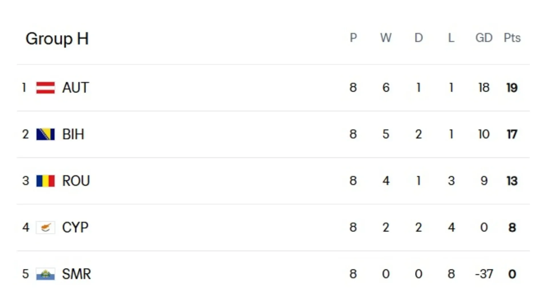 In one of the closest groups, Bosnia and Herzegovina were close to stealing the lead from Austria in the final match and sealing their qualification. However, a 1–1 draw will force them to compete in March for one of the last four European spots in the World Cup.