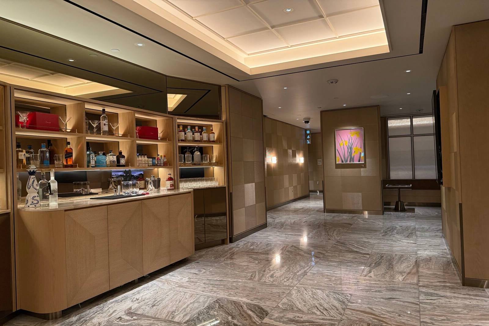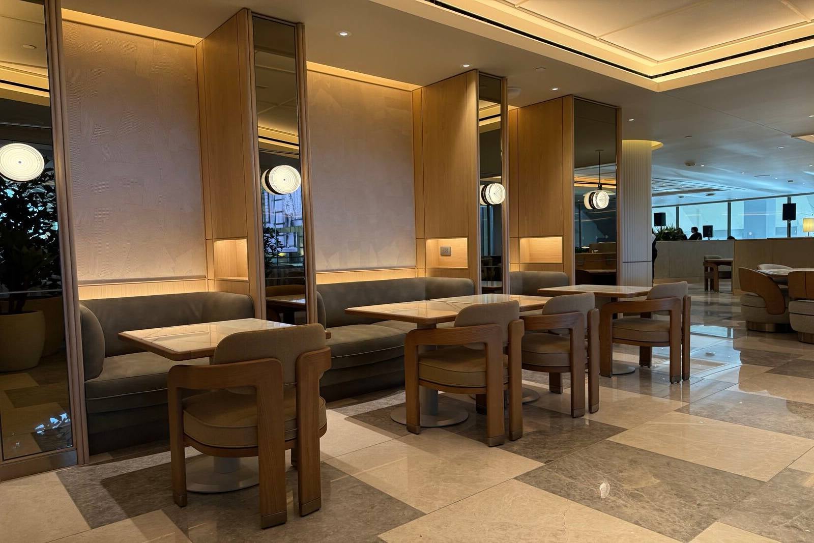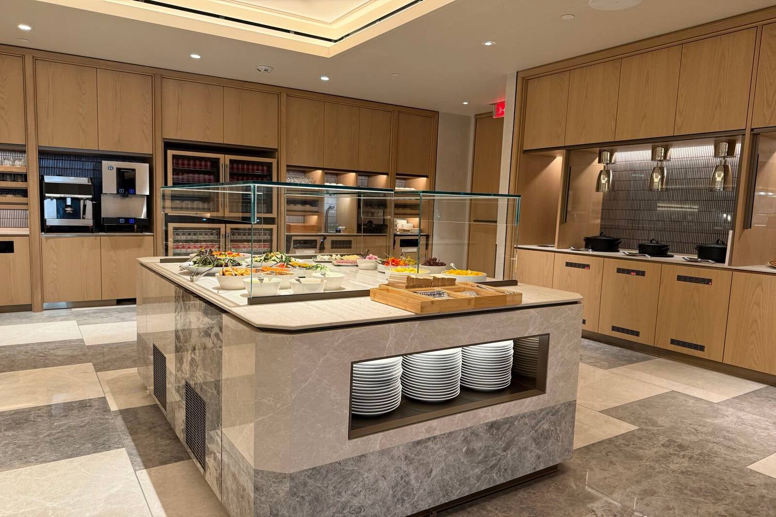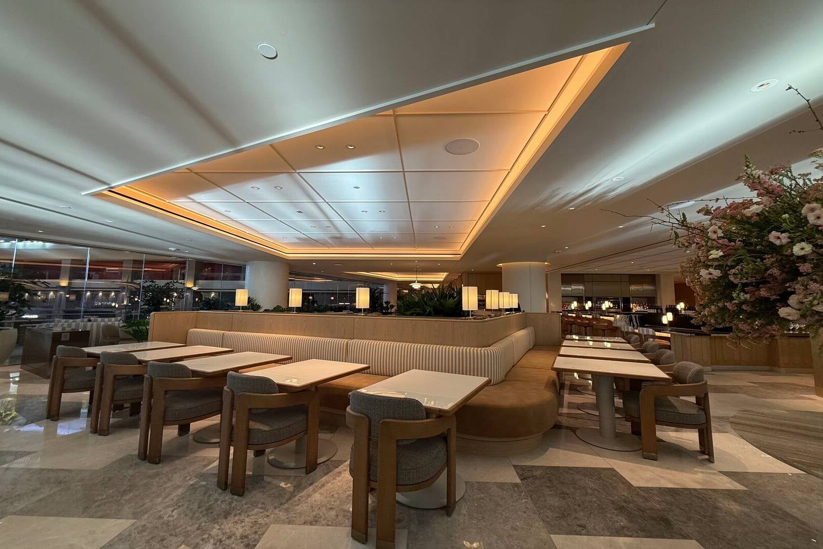 The lounge’s biggest operational upgrade is a full on-site kitchen, moving away from the catered model of the past. The expanded culinary footprint required relocating the First Class Lounge upstairs and allows for a more ambitious dining program.