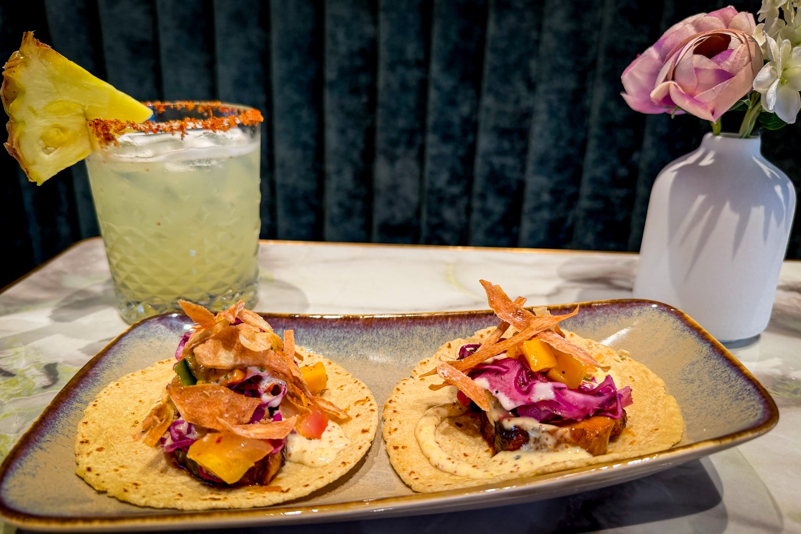 For example, since this is Texas, there are tacos on the menu … but they are braised duck tacos with Korean barbecue, kimchi, roasted garlic miso and mango salsa.