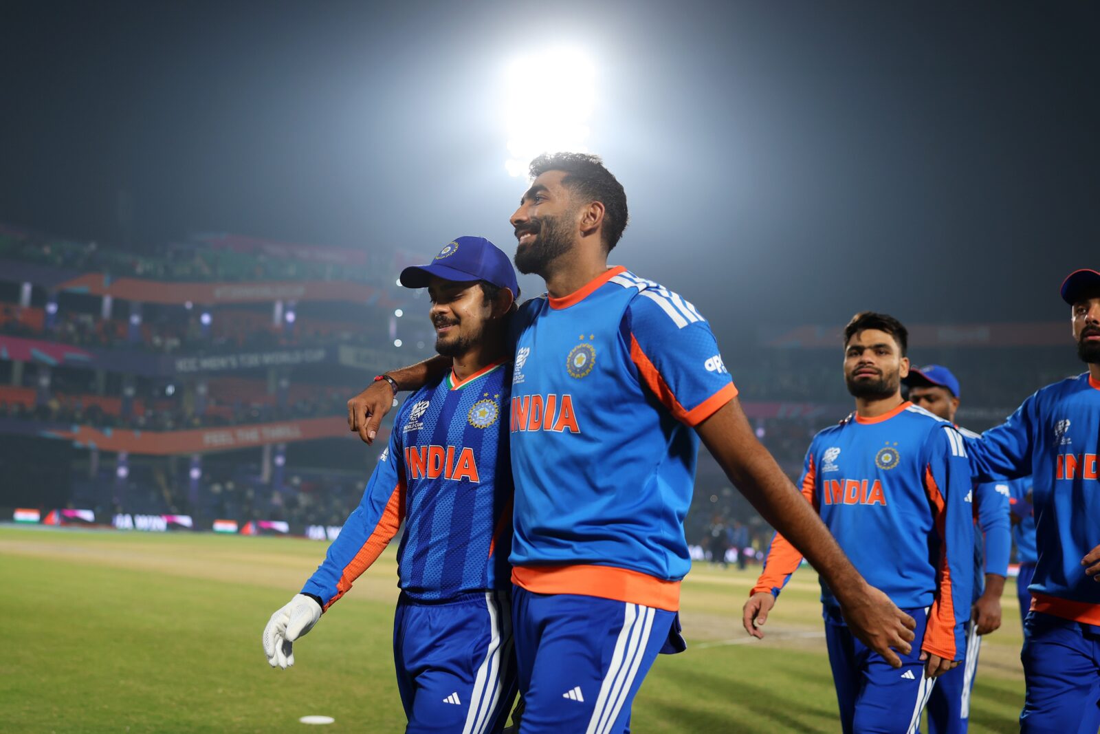 Ishan Kishan and Jasprit Bumrah of India embrace
