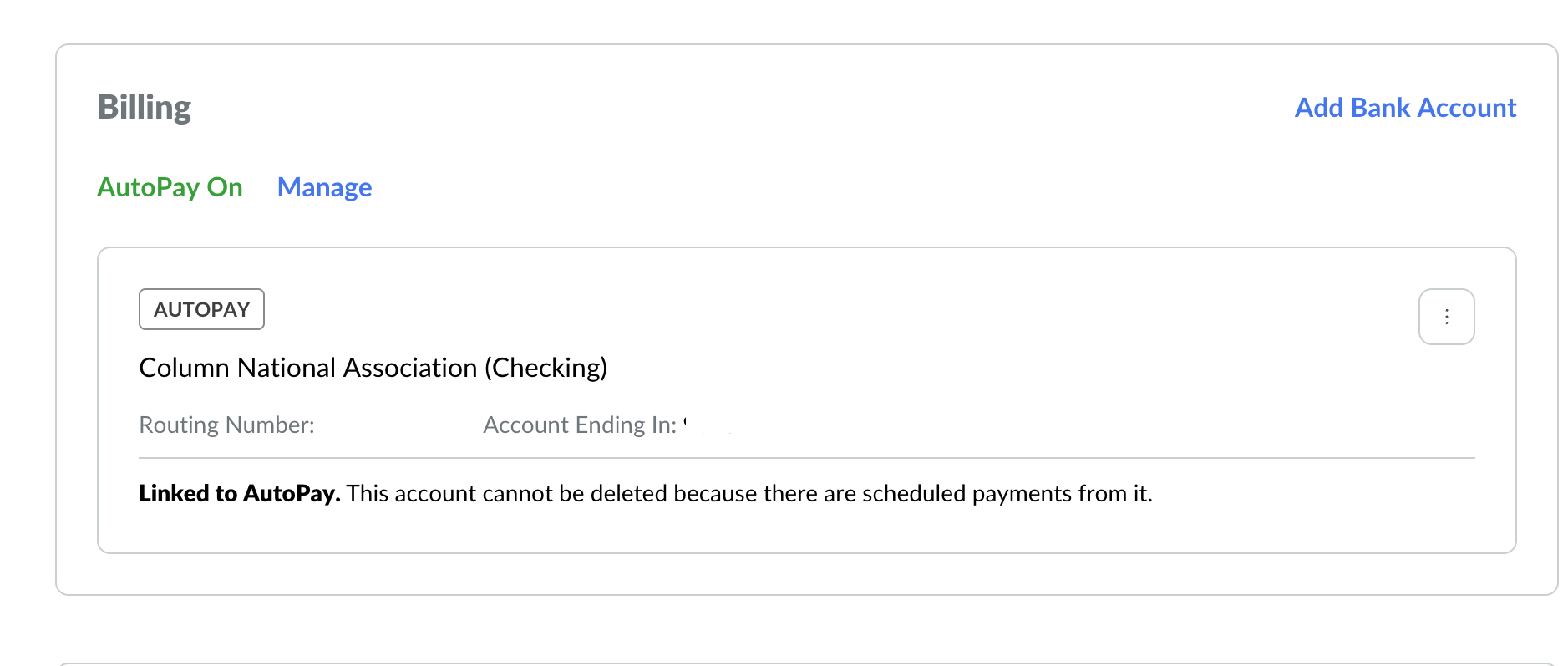 Note that this is not your bank account information you entered when you linked your bank account for the ACH transfer. This is a Bilt-operated account, and these are the routing and account numbers you can enter on your mortgage service provider’s site to make a payment, similarly to how you would with your own checking account.