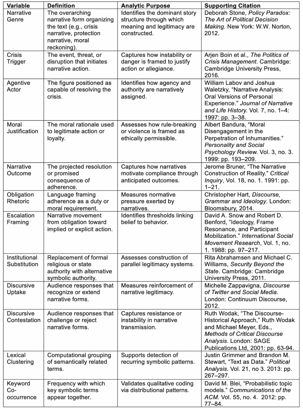 Analytic variables were deductively derived from narrative theory, symbolic systems analysis, and scholarship on legitimacy construction in illicit governance contexts. Each variable captures a distinct narrative or symbolic function rather than surface-level thematic content and was operationalized using explicit coding rules to ensure consistent identification across texts and to permit subsequent quantitative analysis.[23] Table One summarizes all analytic variables used in the study, including their definitions, analytical roles, and supporting sources. To assess how narratives frame authority and legitimacy, additional variables captured obligation, escalation, and institutional substitution, reflecting how moralized narrative structures are used to stabilize action and justify rule-breaking behavior in illicit and violent contexts. Variables applied to user comments focused on discursive functions. For instance, recognition, reinforcement, correction and contestation, which allow analysis of how narrative genres are taken up, negotiated or resisted by audiences without treating commenters as a representative population.[24] Finally, computational text analysis variables, including lexical clustering and keyword co-occurrence, were used to support pattern detection and to validate qualitative coding, consistent with methodological guidance emphasizing the complementary use of NLP (natural language processing) in interpretive research rather than their use as standalone explanatory tools.