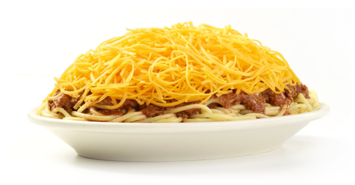 Four-way is basically spaghetti noodles with chili and some cheese on top. And you could put onions on it, and you just mix it together and it comes out as the best dish ever.