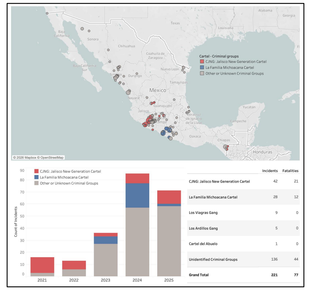Mapping Weaponized Drone Attacks Attributed to Mexican Drug Cartels, NCITE Research Report, 2026.