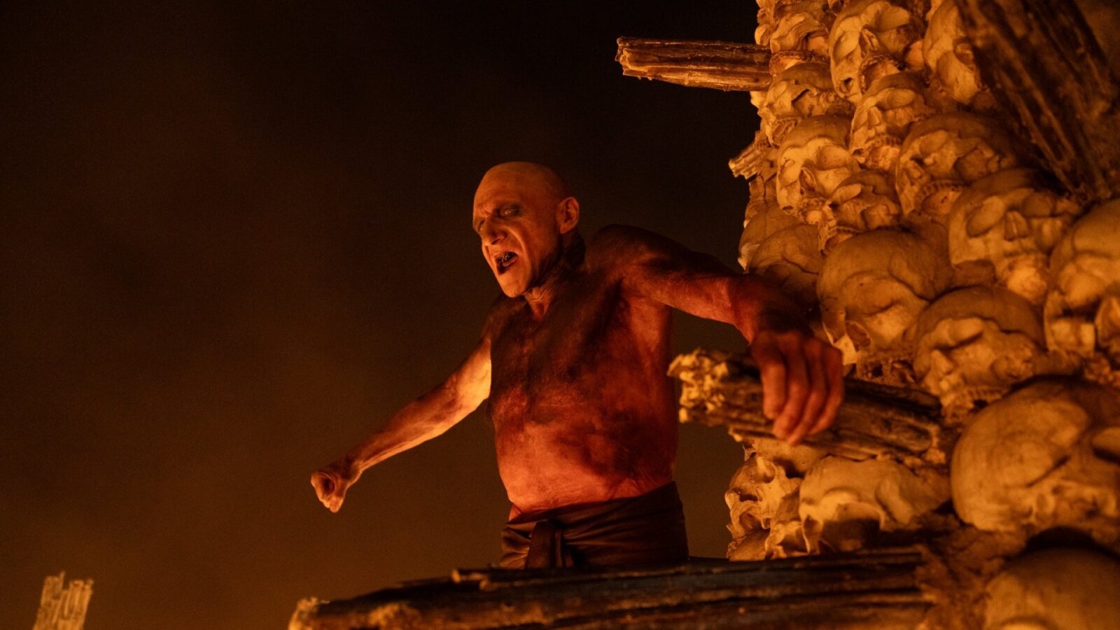 Across 28 Years Later and The Bone Temple, Dr. Ian Kelson is a bit of an odd duck in the post-apocalypse. He lives in a bunker under a towering ossuary he’s made of the bones of the dead. Between that and staining his skin an orangey-red with iodine, he’s an intimidating figure at a distance — mistaken for Satan himself by Jimmy Ink (Erin Kellyman) and her sir, Lord Jimmy Crystal. But up close, he’s a soft-spoken, educated man, eager to offer comfort and compassion however his skills and dwindling supply of drugs will allow.