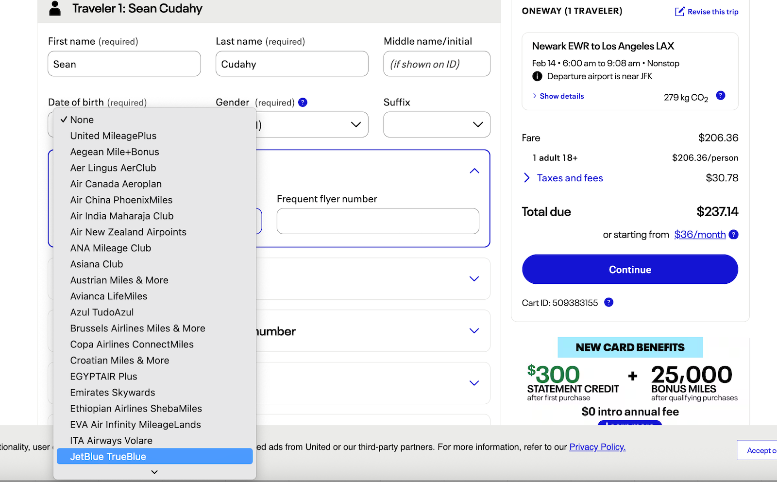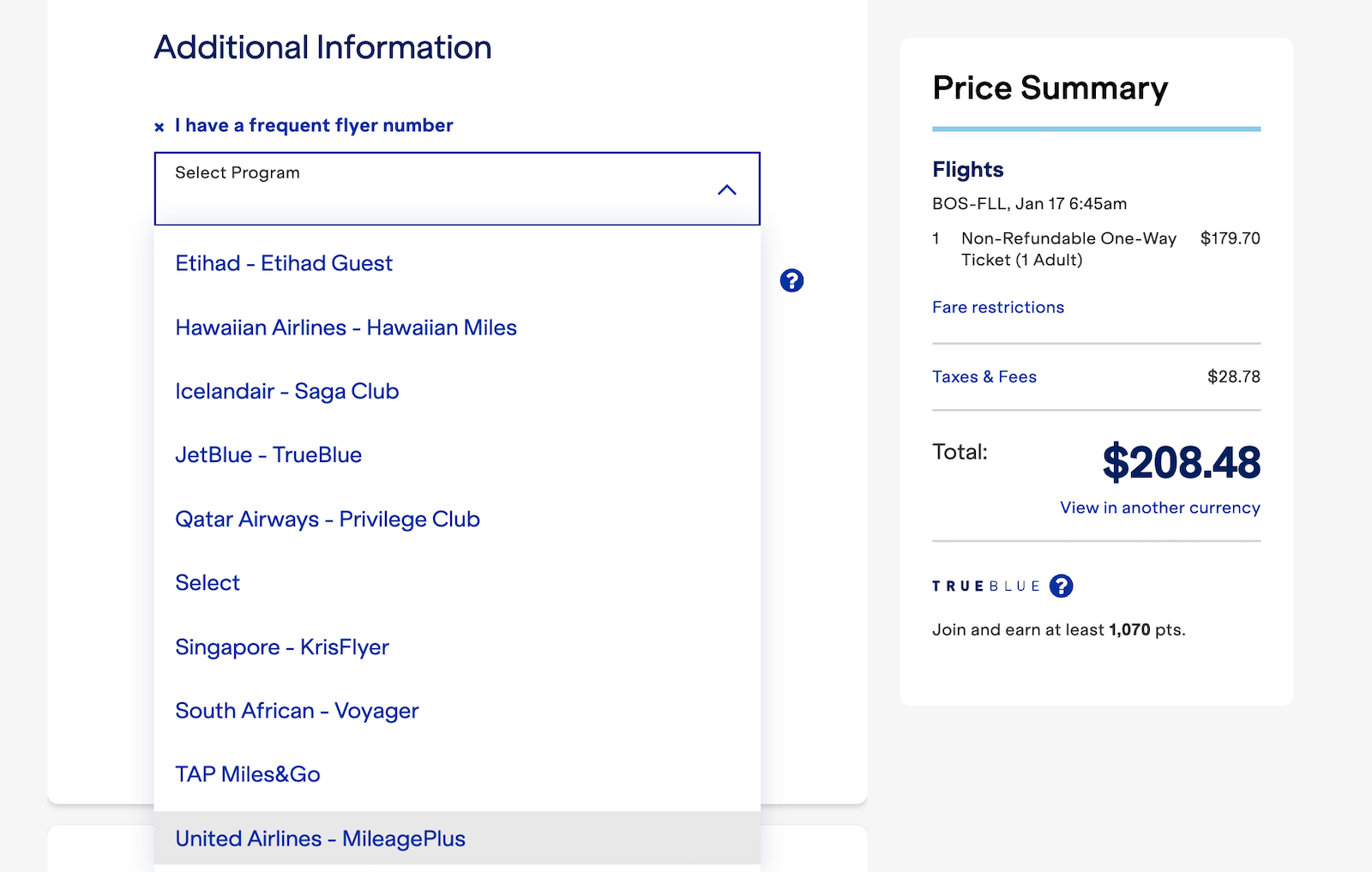 If you want to earn JetBlue TrueBlue points on United flights, you’ll want to book your trip through United’s website. During the booking process, select “JetBlue TrueBlue” as your loyalty program.