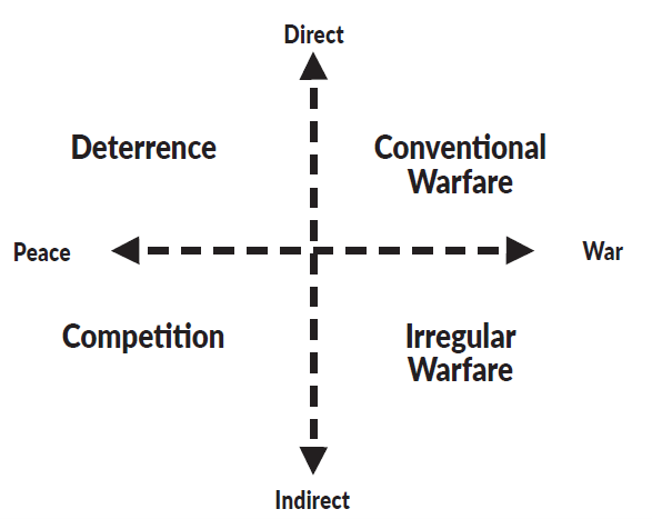 University of South Florida Senior Research Fellow Robert Burrell, in “Resilience and Resistance: Interdisciplinary Lessons in Competition, Deterrence, and Irregular Warfare,” proposed a Full Spectrum of Conflict Design Model to differentiate conventional and irregular warfare, as depicted in Figure 1. This model plots the extent to which operations and activities employ a direct or indirect approach on the Y-axis, and the degree of conflict, ranging from peace to war, on the X-axis. The intersection of these variables categorizes activities into quadrants: deterrence, conventional warfare, competition, and irregular warfare. This model categorizes irregular warfare as the intersection of indirect approaches and war.