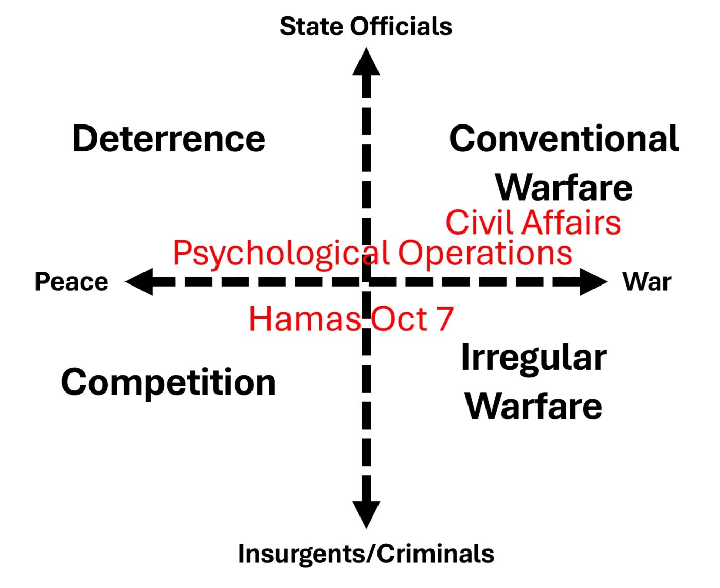 Because indirect approaches are not exclusive to irregular warfare, the model cannot, in practice, differentiate activities that correspond to doctrinal descriptions. In Figure 2, this model is used to categorize the construction of a school in a remote Afghan village in 2013 by U.S. Army Civil Affairs personnel. Because operators employed an indirect approach during wartime, their operations are plotted in the irregular warfare quadrant in contrast to the DoD Dictionary’s classification of these activities as civil-military operations. In Israel on the 7th of October, 2023, Hamas’s raids (operations “to temporarily seize an area to secure information, confuse an enemy, capture personnel or equipment or destroy a capability culminating with a planned withdrawal) upon Israeli security positions employed a direct approach in either peace or war depending on one’s assessment of the state of conflict between Israel and Hamas on the 6th of October. This would plot the attacks on this model in either the Conventional Warfare or Deterrence quadrants. Because the U.S. Department of State has designated Hamas as a terrorist organization, it defines these attacks as terrorism, not conventional warfare, despite Hamas’s employment of direct and asymmetrical approaches. The Military Information Support Task Force’s (MISTF) 2018 efforts in Afghanistan to influence public opinion in support of the elected government are modeled as Irregular Warfare, in contrast to the task force’s objectives.