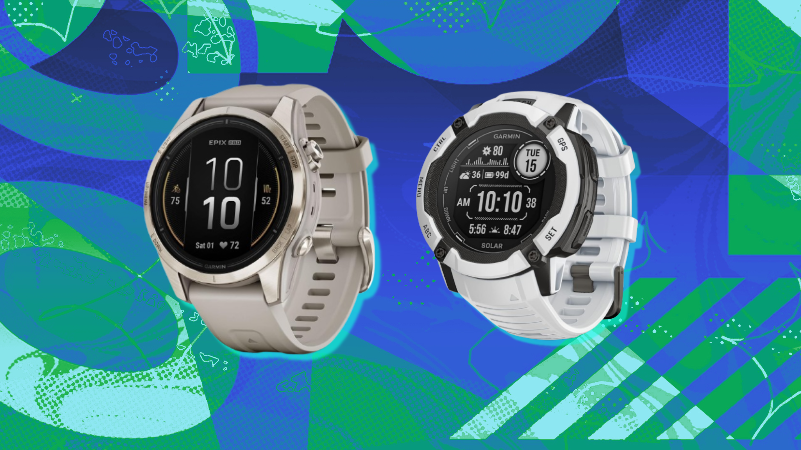 Garmin epix Pro 2 and Instinct 2X Solar with blue and green background