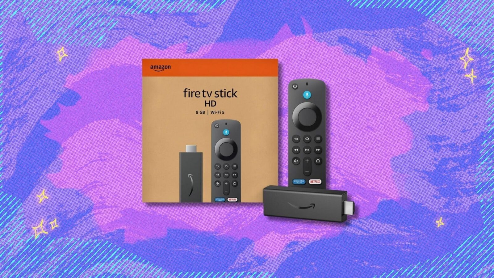 fire tv stick hd and box against a purple patterned background