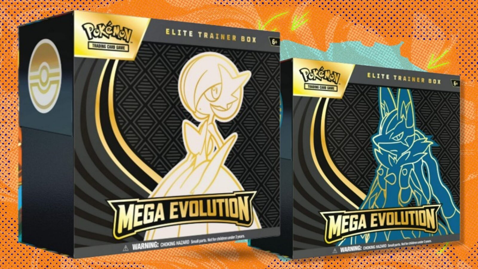 The Mega Gardevoir and Lucario versions of the Pokemon TCG: Mega Evolution Elite Trainer Box on an orange and green background
