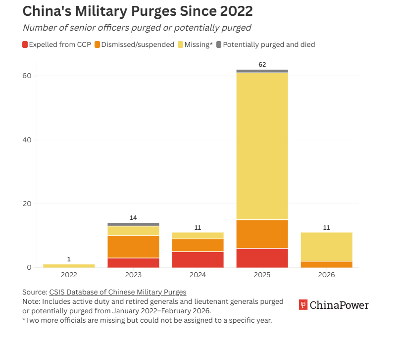 Around 2023, Xi initiated a second major round of purges—this time far bolder and more extensive than before… According to CSIS data and analysis, 36 generals and lieutenant generals have been officially purged since 2022… This brings the total of confirmed and potential purges to a staggering 101 people.