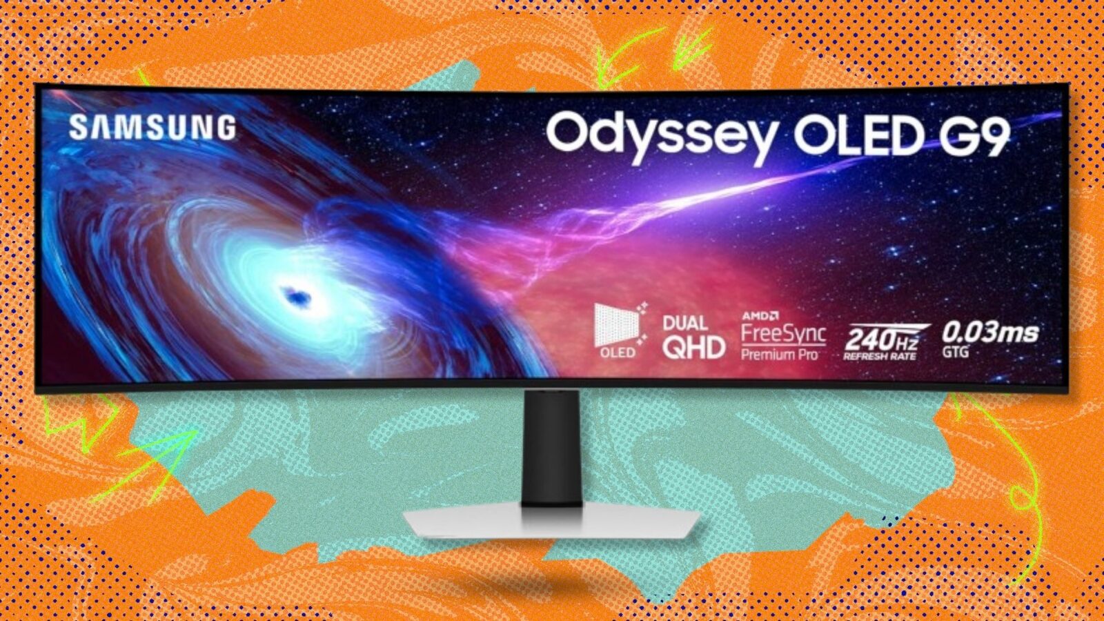 The 49-inch Samsung Odyssey G9 QD-OLED gaming monitor on a green and orange background