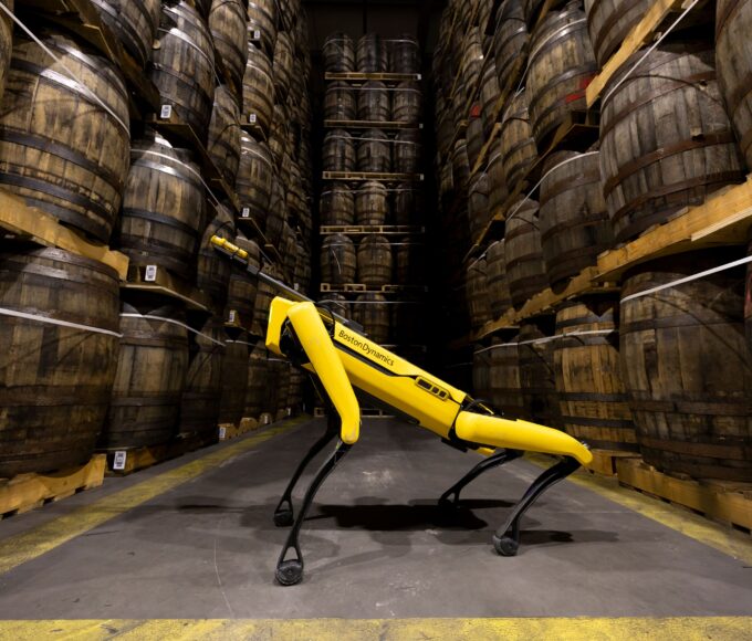 Inside Dewar’s cavernous whisky warehouses, man’s best mechanical friend—a Boston Dynamics robot...