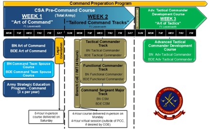 On Saturday following Week-1 of CSA-PCC, students attend the Legal Orientation Day, delivered at Ft. Leavenworth by the Judge Advocate General School. Course work for Week-2 begins with branch-specific briefings for all students, followed by three tailored command tracks in which students join seminars of peer commanders or command sergeants major (Command Sergeants Major track, Functional Commander Track, and Tactical Commander Track). In the past, command sergeant major development and functional and tactical command-specific education were situated in separate courses following PCC (CSMDC, FCDC, and TCDC). The new course design incorporates those separate courses as Week-2 tracks within the CSA-PCC. The past course design often prevented USAR and ARNG students from attending the separate courses due to limited training days authorized by their components (usually a 2-week annual training period). The new curriculum makes the tailored command track education available to all three components of the Total Army.
