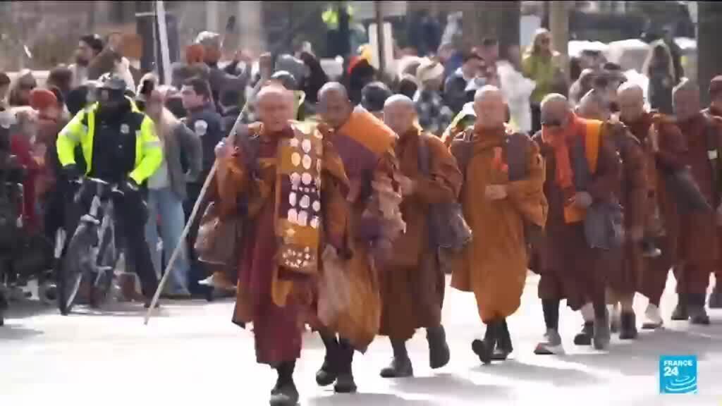 A group of Buddhist monks, a day after completing a 108-day Walk for Peace from Texas to Washington, walked to Capitol Hill on Wednesday before heading to the Lincoln Memorial to conclude their journey. The 19 monks and their dog, Aloka, walked 2,300 miles (3,700 kilometers) across several Southern states — sometimes in frigid conditions — drawing large crowds in churchyards, city halls and town squares. FRANCE 24’s Emerald Maxwell reports.